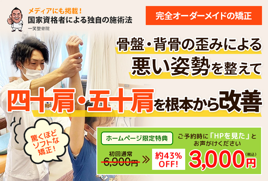四十肩・五十肩の原因は「骨盤・背骨の歪みによる姿勢の悪化(猫背)」ですが、これらを放っておいたままでは、いくら湿布を貼ったとしてもすぐに再発をしてしまいます。